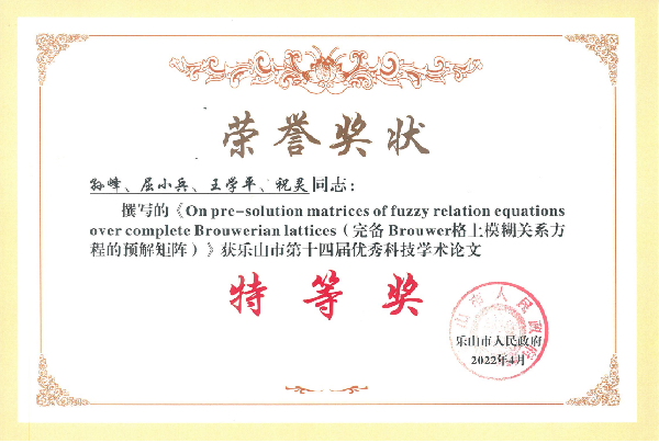 经乐山市第十四届优秀科技学术论文专家评审组评审,我校教师孙峰、喻世刚等的论文获特等奖;我校教师黄果、易志刚、马旭光、刘才铭、喻世刚、周勇等的论文获一等奖。